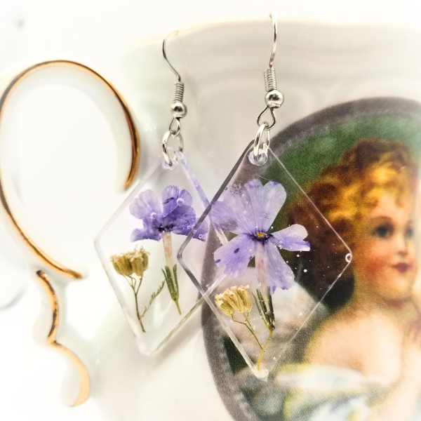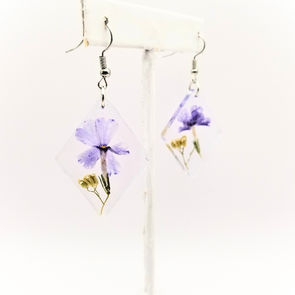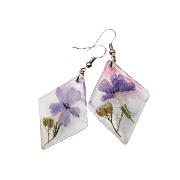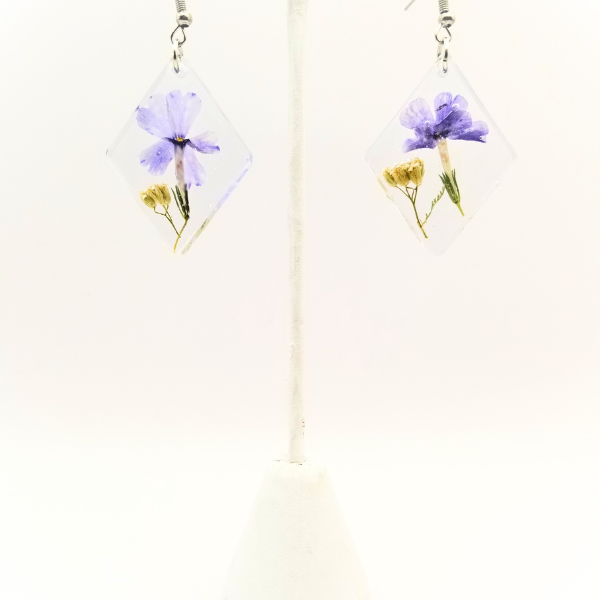 These handcrafted resin earrings feature delicate pressed purple blossoms and tiny yellow buds, preserved forever in crystal-clear resin. Lightweight and hypoallergenic, each pair captures the beauty of nature in a modern diamond shape—perfect for adding a touch of floral elegance to any outfit.