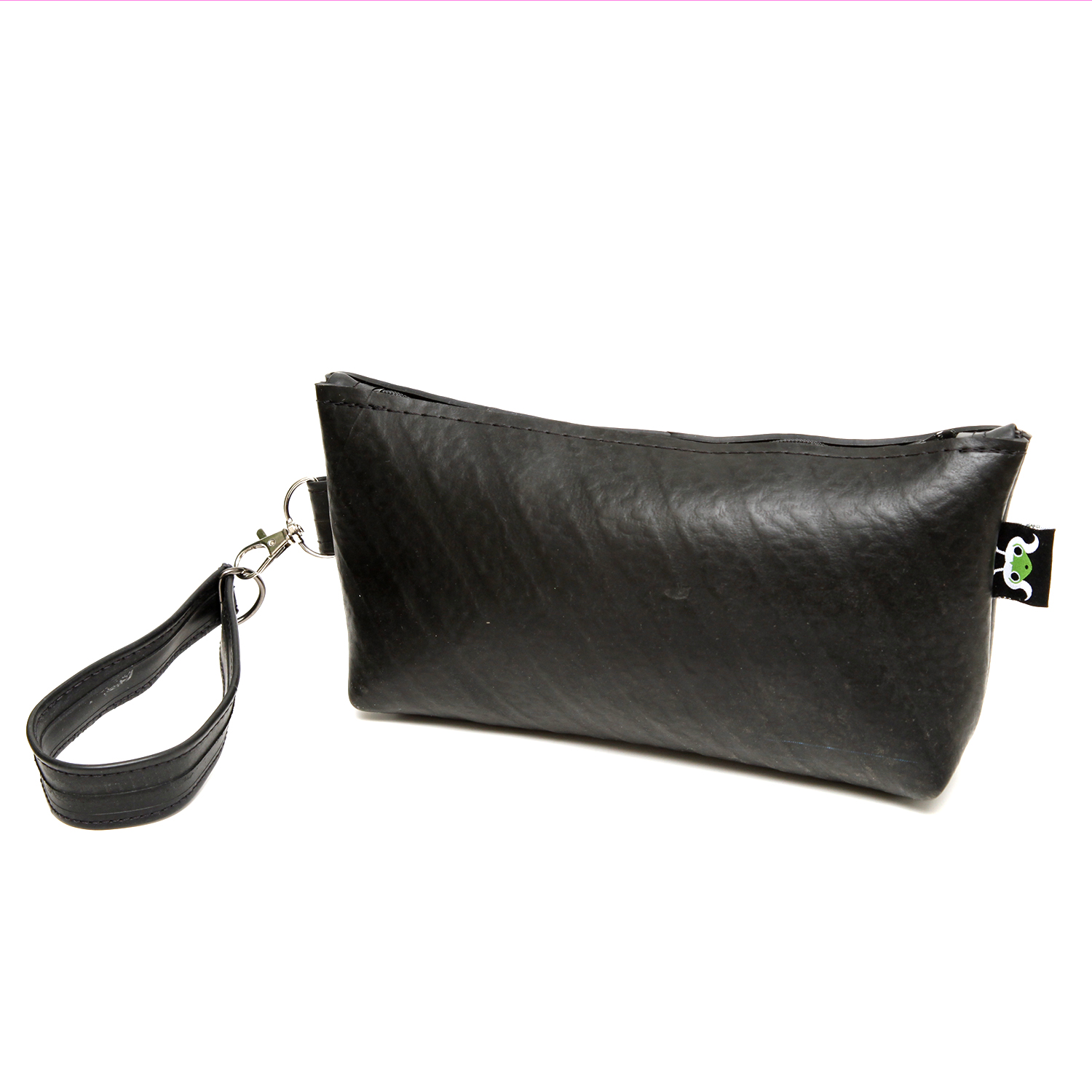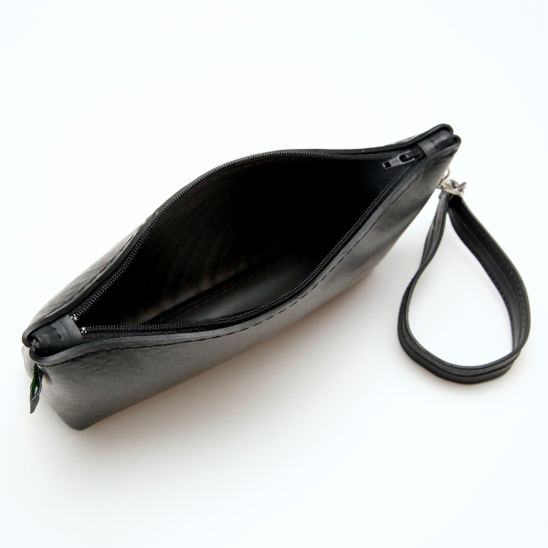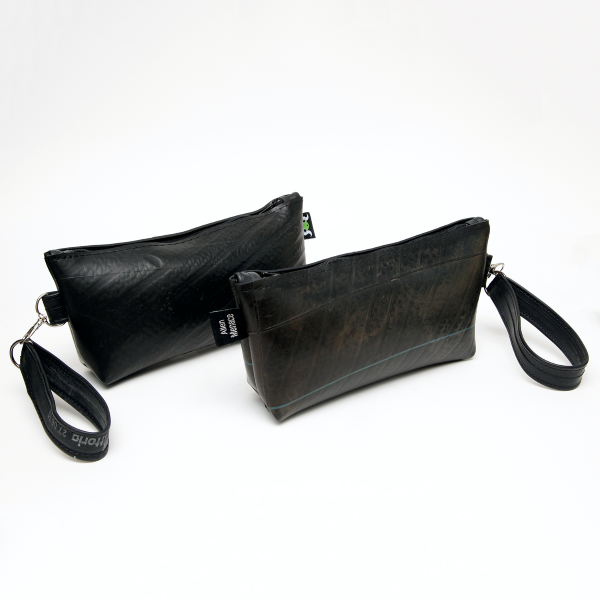 With a sleek, industrial look and unique character from its past life, this pouch is the ideal eco-conscious companion.