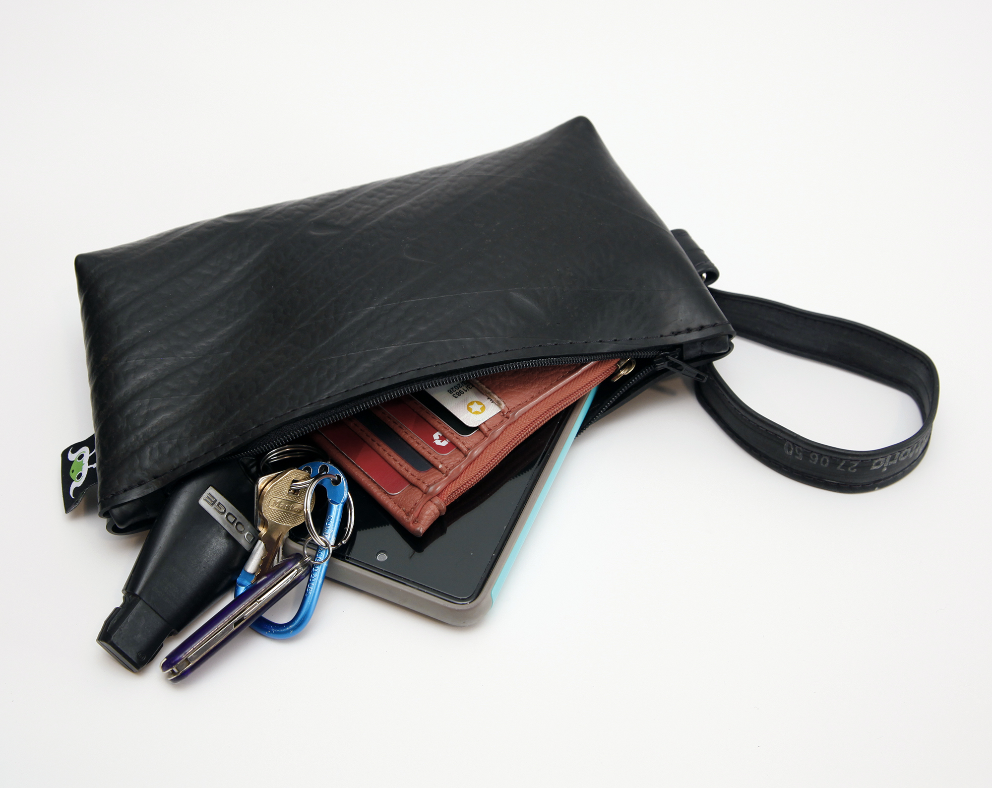 Made from repurposed bicycle inner tubes, this compact zipper pouch is both tough and environmentally friendly. Each pouch features a secure zip closure, a sturdy metal clasp for attaching to bags or belts, and a water-resistant exterior that’s built to handle everyday wear. Perfect for holding keys, coins, earbuds, or other small essentials on the go.